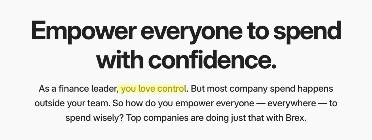 The closest Brex gets to calling out a problem is this line: “As a finance leader, you love control. But most company spend happens outside your team.” It also makes passes at “giving you control” and helping you “spend smarter.” OK, there’s an implied problem around “lack of control”, but what are the consequences? This idea doesn’t have enough bite to it. Score: 4/10