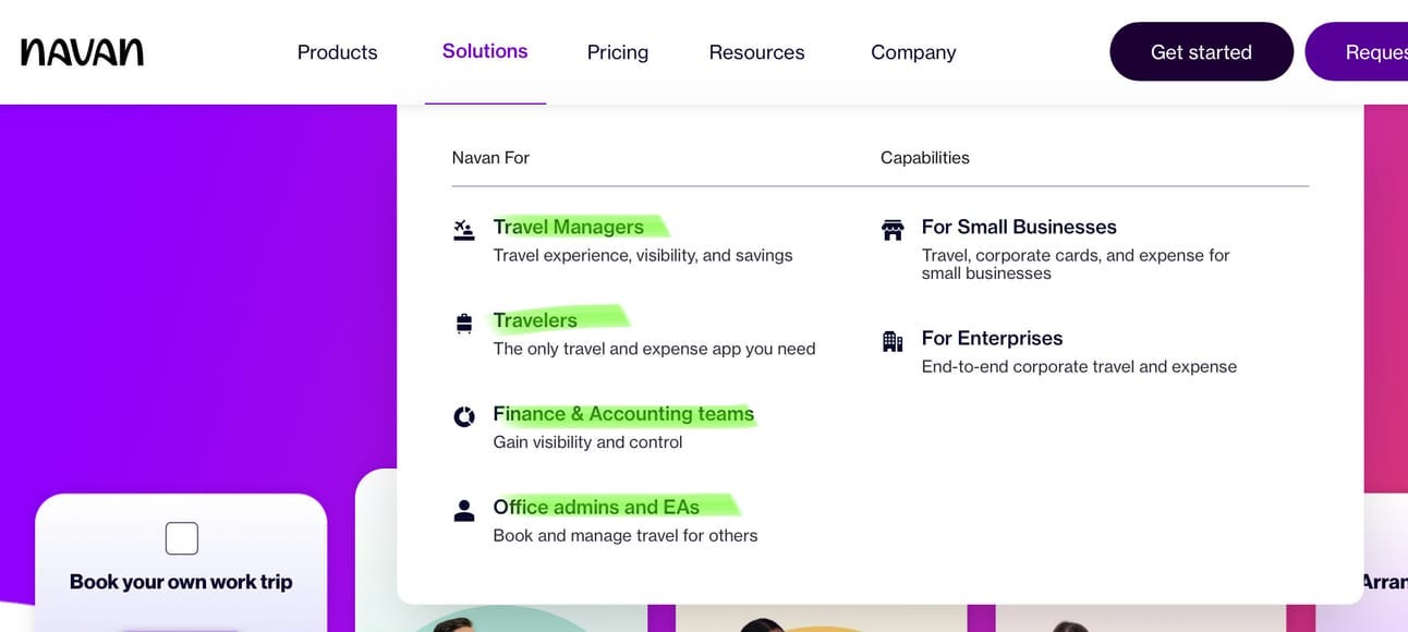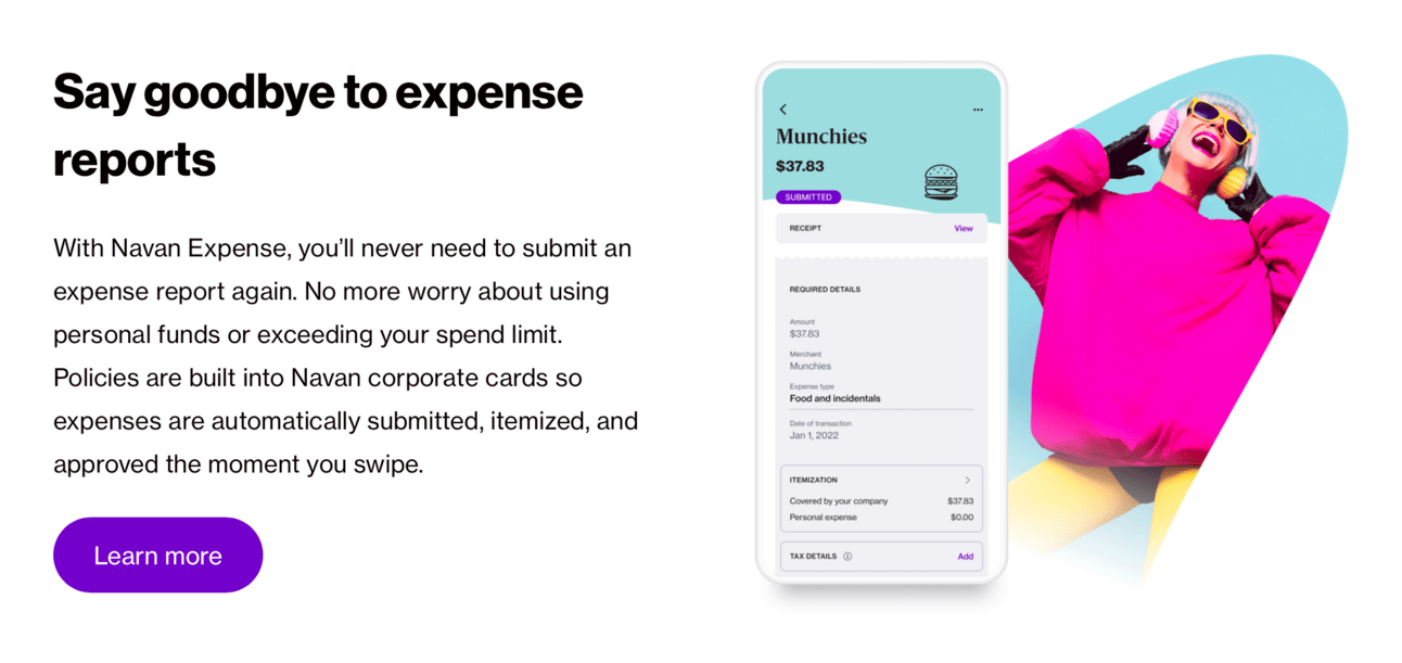 Navan doesn’t fuss around with fancy terms. It’s “the only integrated Business Travel & Expense solution.” Navan doesn’t describe why this integration matters, but at least it’s easy to grok. Navan’s also better at calling out its audience, with pages that speak directly to travel managers, office admins, and finance teams. Like its competitors, though, it still tries to appeal evenly to the full gamut of company sizes. Score: 7/10