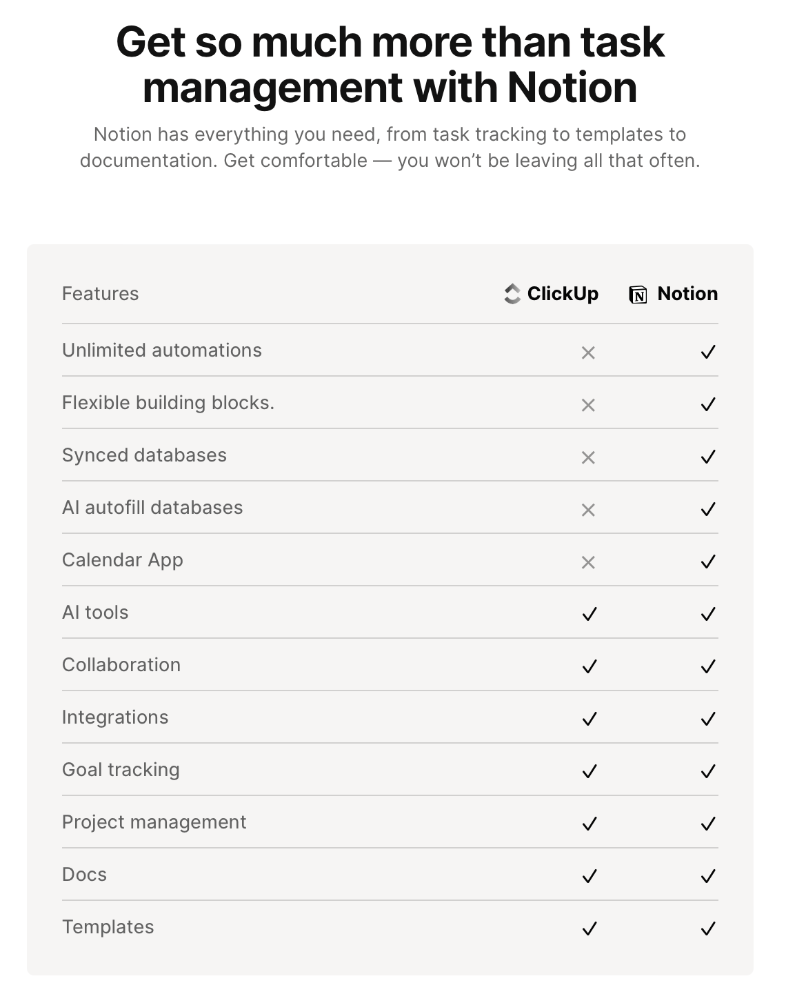 It’s only hinted at, and comparisons frame the argument about who has more features instead. But that’s not the argument Notion should be trying to win. Remember, its POV is based on the idea that all-in-one platforms are preferable to point solutions. This choice of framing around features ends up putting Notion on its competitors on the same playing field; but instead, Notion should be defining a new playing field entirely.