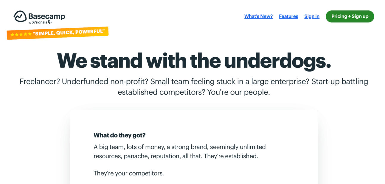 Jira is “The only project management tool you need to plan and track work across every team,” and Basecamp puts “everything in reach, and every piece of information tracked and organized, everyone knows where to find what they need, and say what they need to say.”